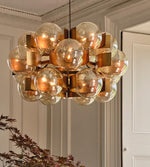 The Allis chandelier is our take on mid-century style pendants seen in White City House. Eighteen champagne tinted glass globes have bubbles throughout the glass to cast shadows and add texture to your lighting scheme.