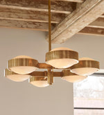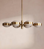 Edith pendant chandelier is a vintage style that draws inspiration from the 1970s interiors of White City House. Six moulded and ribbed glass shades sit on an antique brass-finish frame, which when lit give off a warm, milky glow.