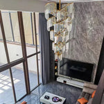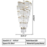 This artistic crystal oversized chandelier is made of high quality crystal and hardware, the crystal long strips are neatly arranged, using space and visual hierarchy to form an appearance with strong modernist characteristics, the lamp body focuses on the use of geometric elements, diamond-shaped layers staggered to form a distinctive sense of space and visual enjoyment. This lamp can be decorated in any place to create an elegant an